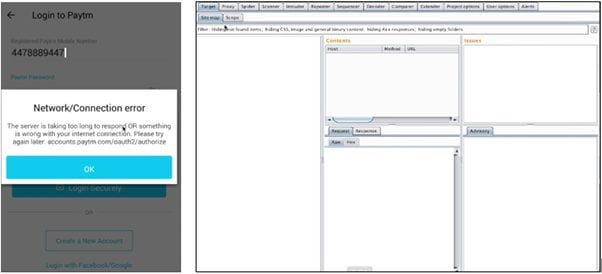 In the diagrams illustrated below, we have a Paytm Android mobile app which does not allow the interception of network traffic going through the burp proxy.