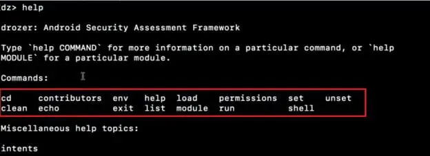 Step5: Now we are inside the Drozer shell. For a list of commands in the environment, type help command as shown in the screenshot below.