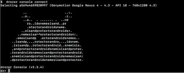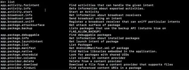 Drozer is built on various modules. I would suggest going through all the modules to understand them better. We will discuss some of the modules here. Just issue the command list on the drozer console as shown.