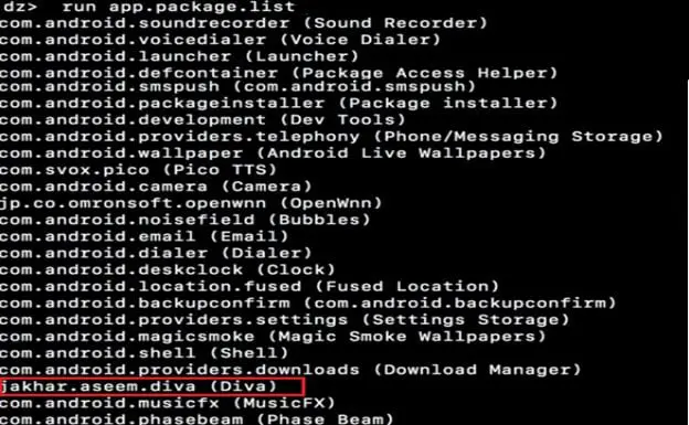 Step2: To locate and get the package name of DIVA application through type the command "run app.package.list"