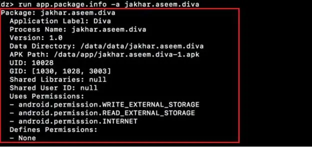 Step3: In the screenshot above, we have located the package. To get more information about the application such as Process Name, User ID, Group ID, Permissions, etc., type command "run app.pacakage.info –a jakhar.aseem.diva" as shown below.