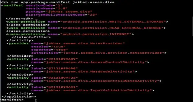 Step4: To inspect the manifest file of DIVA, run "run.package.manifest jakhar.aseem.diva" as shown below.