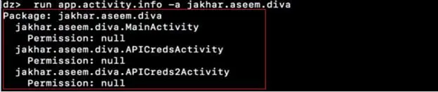 Step2: To see the exported activities, we use the module app.activity.info as shown in the screenshot below. It gives more details about the exported activities.