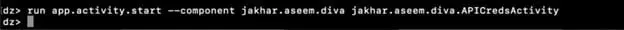 Step3: Let's try to exploit and invoke the jakhar.aseem.diva.APICredsActivity activity from the drozer client. We will see its effect on the emulator running the vulnerable app DIVA. To do that use the module "app.activity.start" and issue the command with the necessary flags as shown in the screenshot below.