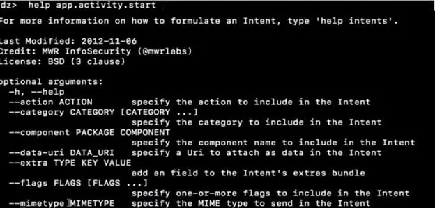 Step4: Drozer provides support to create more complex custom intents. The module "app.activity.start" helps to create more formulate intents. We can use help command to get more information on the same.