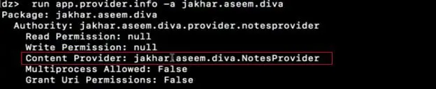 Step1: Let's exploit the exported content providers. As we have seen in the previous screenshot, there was one exported content provider. To get more information on the same, use module app.provider.info as shown in the screenshot.