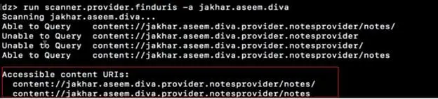 Step2: Now let's fetch the data from the content provider. To do so, we will use scanner module of drozer "scanner.provider.finduris" to find out the URI's which we will be able to query. The screenshot below shows there are two URI's which can be queried.