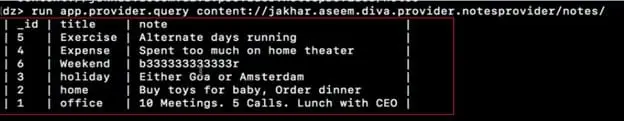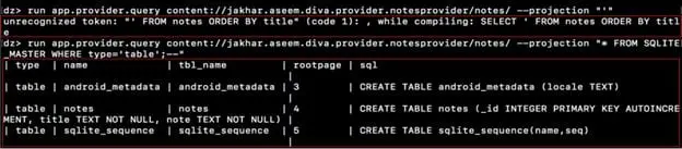 Step5: By issuing the SQL query using app.provider.query module of drozer, we see the SQL tables are exposed, which is evident in the screenshot below.
