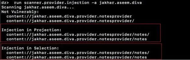 Step4: We can further scan through drozer for SQLI in content providers. Using the scanner module scanner.provider.injection as shown in the screenshot below, we see there are two injection points in the projections.