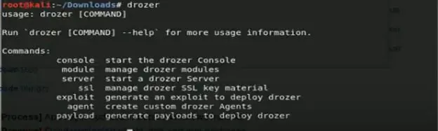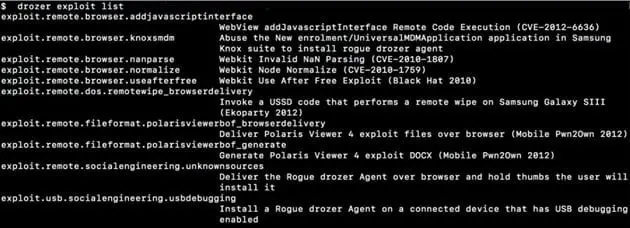 To see the exploits list of Drozer type "drozer exploit list " on the console as shown.