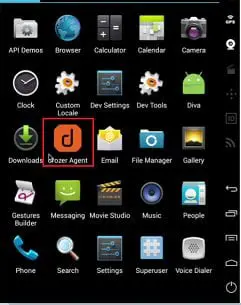We see the orange icon with d in the application menu; we have our drozer Agent installed in the emulator.