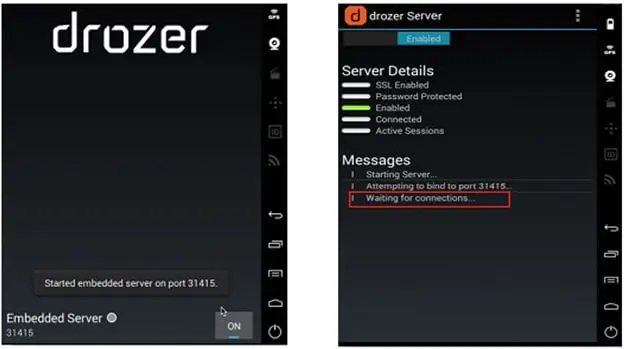 Step 2: Click on the agent application and turn the embedded server on. We see the embedded server has started on port 31415. By clicking on the embedded server, we see the details and that the drozer Agent (Drozer Server) is waiting for the connection.