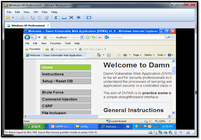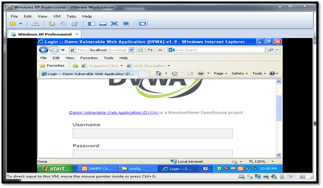 Here, we will learn how to host a vulnerable application in the virtual machine. Since we have one Windows XP virtual machine up and running, we will see how to host vulnerable application on the same. For this exercise, we will configure Damn Vulnerable Web Application (DVWA). This application is vulnerable to several web-based vulnerabilities like Cross-site scripting (XSS), SQL Injection, CSRF, Command injection, etc.