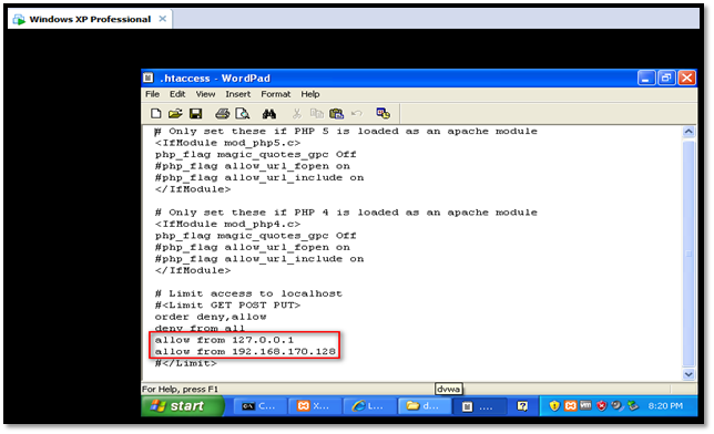 Go to " C:xampphtdocsdvwa " folder, open the "HTACCESS File", locate the "allow from" line and enter the IP address of the Kali Linux machine here, as shown in the following screenshot.