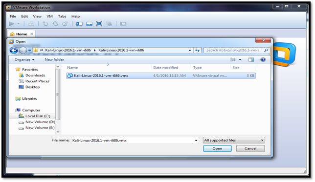 Step 3: Locate the downloaded folder, select the "Kali_Linux-2016.1-vm-i686.vmx" file and click the "Open" button.