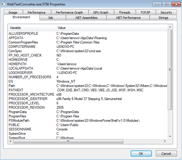 'Process Explorer' tool determines which your application uses environment variable at runtime. The following figure is showing the environment variables used by 'Web Text Convertor' tools as following: