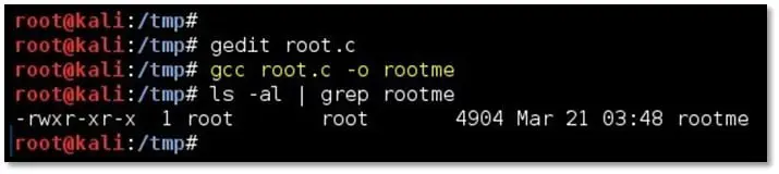 gcc root.c -o rootme (This will compile the C file to executable binary)