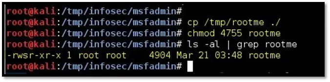 Step 12: Copy the compiled binary to the msfadmin directory in NFS share. Set the SUID bit using the following command: