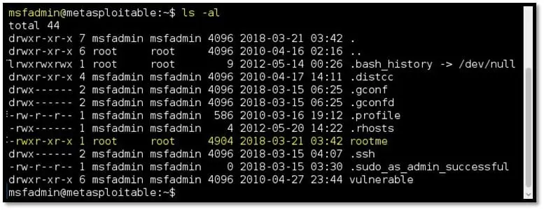 Step 13: List the content of msfadmin directory by using the ls -al command. Observe the “rootme” file is owned by the root user.