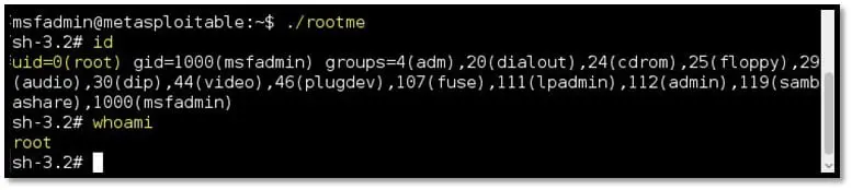 Step 14: From the SSH session, run the “rootme” binary file. Since the file is owned by the root user and the suid bit is set, the command inside it will give the shell with root privilege.