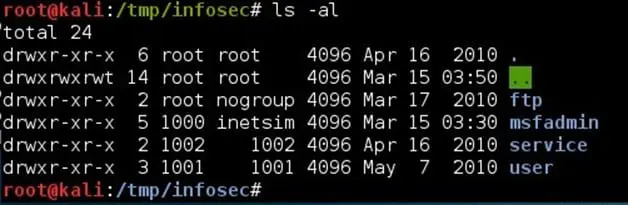 Step 5: Navigate to /tmp/infosec directory and list the content. The content listed is from the /home folder of the remote host