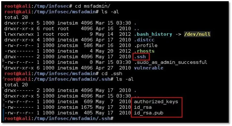 Step 8: Navigate to /tmp/infosec/msfadmin/.ssh folder and append the newly created public key into the authorized_key of the msfadmin user