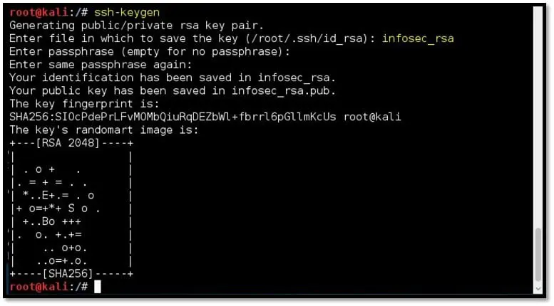 To create an SSH key pair, we will use the ssh-keygen command on our attacking machine, i.e., Kali Linux. Follow the steps on screen, provide the file path and passphrase. We can keep the passphrase blank by simply hitting the “Enter” button of the keyboard.