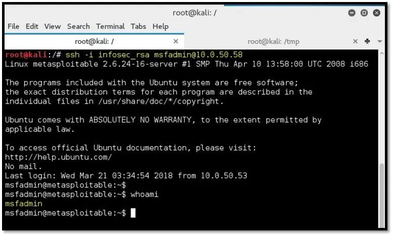 ssh -i infosec_rsa msfadmin@10.0.50.58
