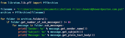 In Python, the libratom package makes it simple to process Microsoft Outlook email archives using PffArchive.