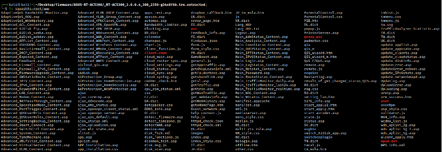 In this laboratory, we will use the model RT-AC5300 from Asus. To see the files embedded in the firmware file, we need to use the binwalk tool. Using the option "-e," all the files can be extracted from the .trx file. [CLICK IMAGES TO ENLARGE]
