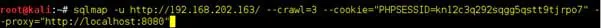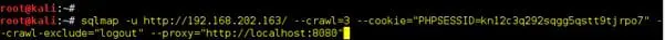sqlmap -u http://192.168.202.163/ --crawl=3 --cookie="cookie value" --crawl-exclude="logout"