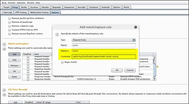 Now, think about a scenario where the sqlinjection keywords like OrderBy and Union are blacklisted on the server. We can bypass these types of implementations by using the camel casing technique. We will use SQLMap to send the traffic to Burp and use the "match and replace" feature of Burp to bypass the above restriction.