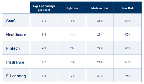 Many of these industries also have significant findings per asset, as shown in the table below. Cobalt calls out that e-learning, an industry that experienced rapid growth in 2020 due to the pandemic, is struggling the most.