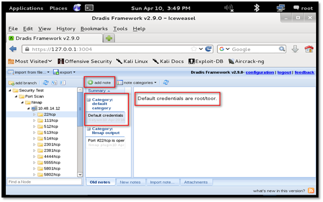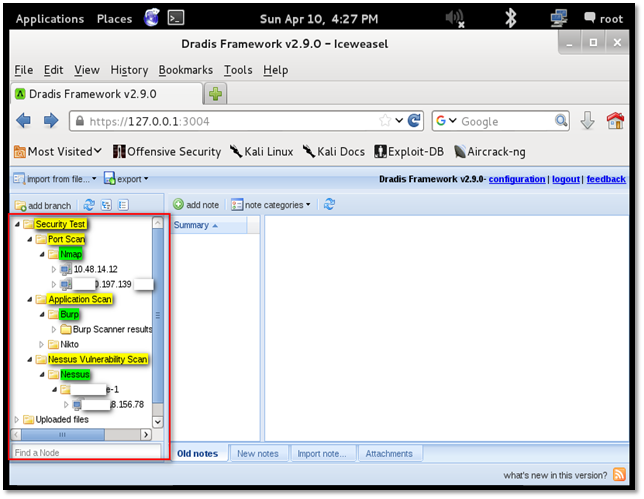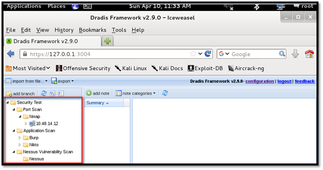 We can create a tree as per our convenience. In the below screenshot, "Security Test" is divided into three sub-branch namely "Port Scan", "Application Scan" and "Nessus vulnerability scan". Each sub-branch is further divided by different tools.