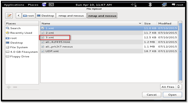 Click the "import file from..." button, select "NmapUpload" from the drop-down box, browse to the file and select the file to upload.