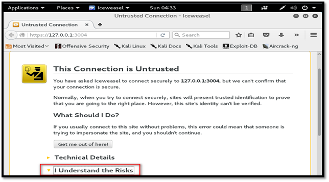 Avoid the certificate error and click the "I Understand the Risks" button to add an exception for Dradis. The certificate error comes because Dradis is using a self-signed certificate.