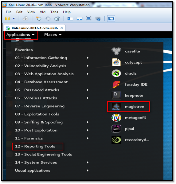 Launch the Kali-Linux tool. Click on "Applications", go to "Reporting Tools" and click on "Magic Tree".