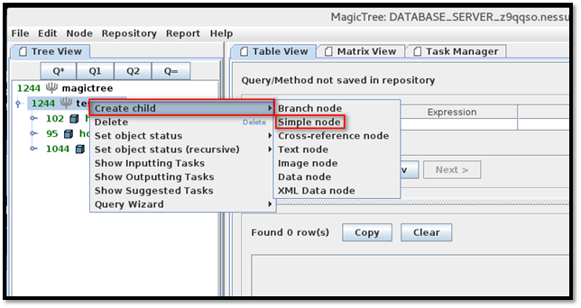 One more unique feature of Magic Tree is to be able to run Nmap from the user interface. Right click on the "test data" note, go to "Create child" and click the "Simple node" option.