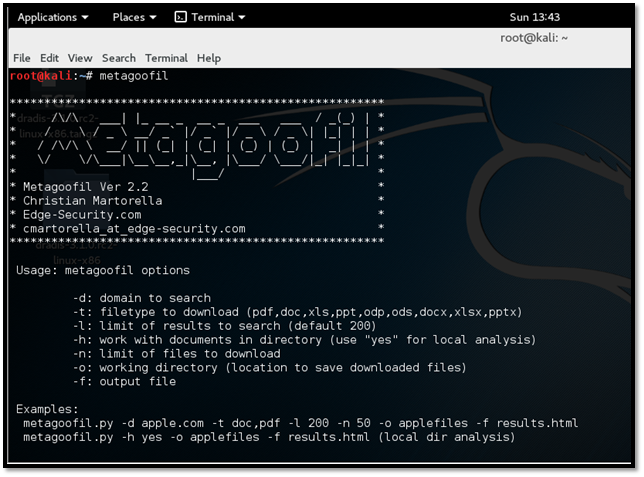 Step 2: Once installed, run the following command to see the options available in metagoofil.