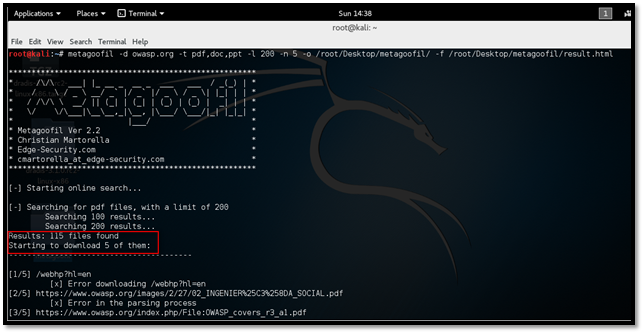 metagoofil -d owasp.org -t pdf,doc,ppt -l 200 -n 5 -o /root/Desktop/metagoofil/ -f /root/Desktop/metagoofil/result.html