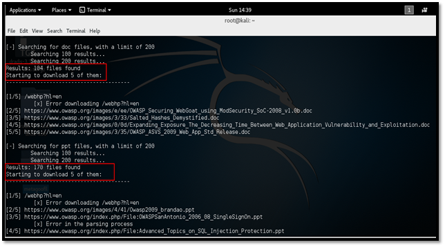 Step 4: Let us try this command on a live website. We will run metagoofil on https://www.owasp.org