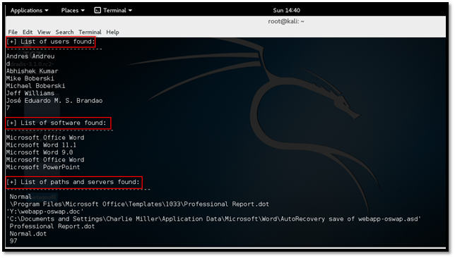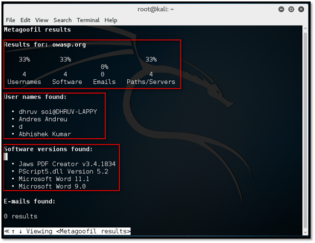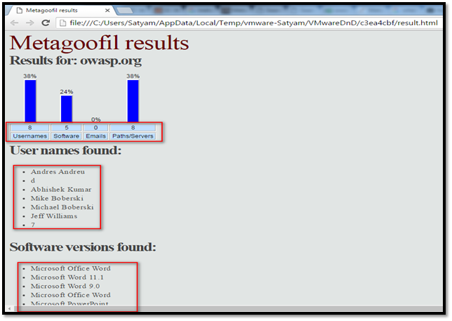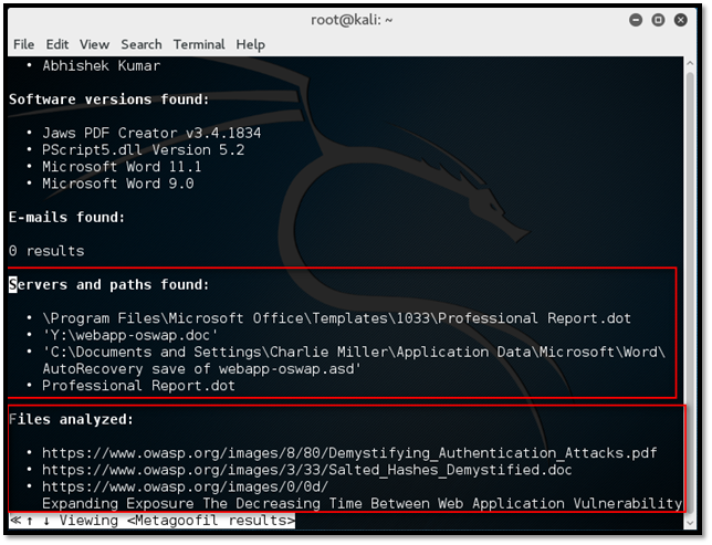 Metagoofil is an information gathering tool designed for extracting metadata of public documents (pdf,doc,xls,ppt,docx,pptx,xlsx) belonging to a target company. It is a part of reporting tools under Kali Linux framework. It can give a lot of important information by scanning the obtained files. It can generate an HTML page with the result of the metadata extracted, plus a list of potential usernames, very useful for preparing a brute force attack on open services like ftp, web application, VPN, pop3, etc. These type of information help penetration tester during the information gathering phase of the security assessment.