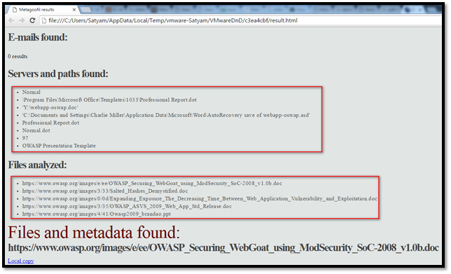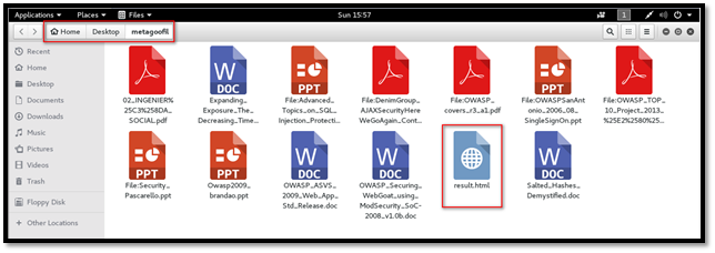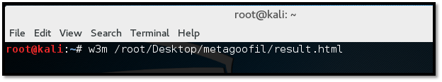 Here /root/Desktop/metagoofil/result.html is the path of result.html file. Press enter, and we can see the content of the result.html file in the terminal.