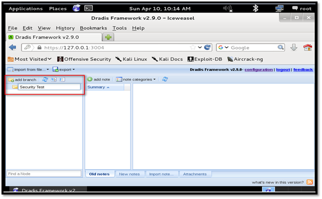 Now we can start using Dradis by creating a new branch. Click the "add branch" button and name it as "Security Test."
