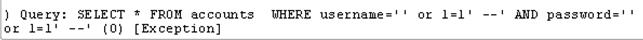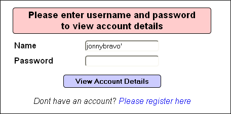 Query: SELECT * FROM accounts WHERE username='jonnybravo'' AND password='momma'