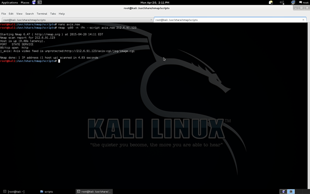 I will automate all scanning stuff and exploiting through a .nse file, you know the old days of hacking like going through someone's camera that may be private or public. The most popular one is hijacking an AXIS camera. I am demonstrating the technique below.